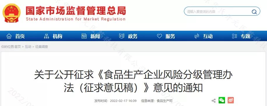 為推進(jìn)食品生產(chǎn)企業(yè)食品安全風(fēng)險分級與信用風(fēng)險分類(lèi)管理,優(yōu)化監管資源配置,2022年2月17日,國家市場(chǎng)監督管理總局發(fā)布了關(guān)于公開(kāi)征求《食品生產(chǎn)企業(yè)風(fēng)險分級管理辦法(征求意見(jiàn)稿)》意見(jiàn)的通知。
